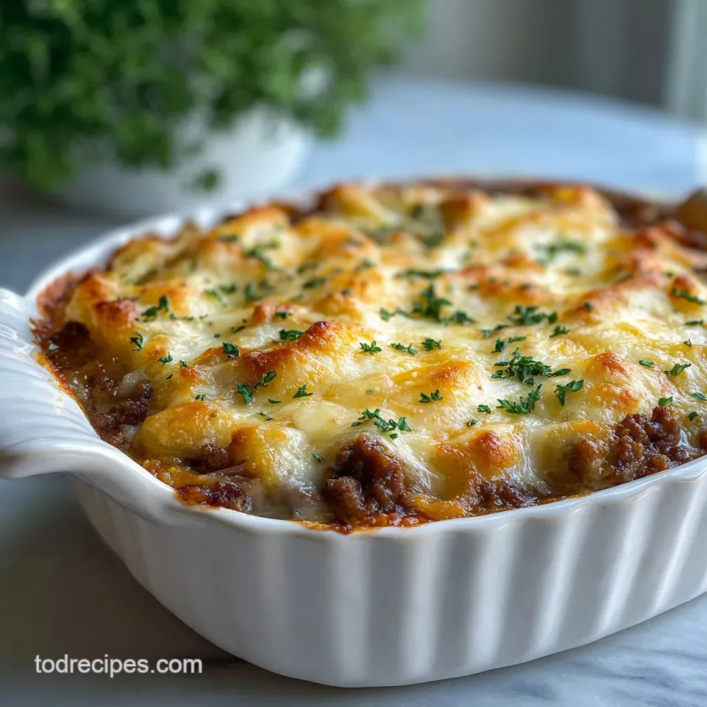 - Flavor/Texture Hook: Savory, onion rich cream sauce paired with a shatter crisp topping